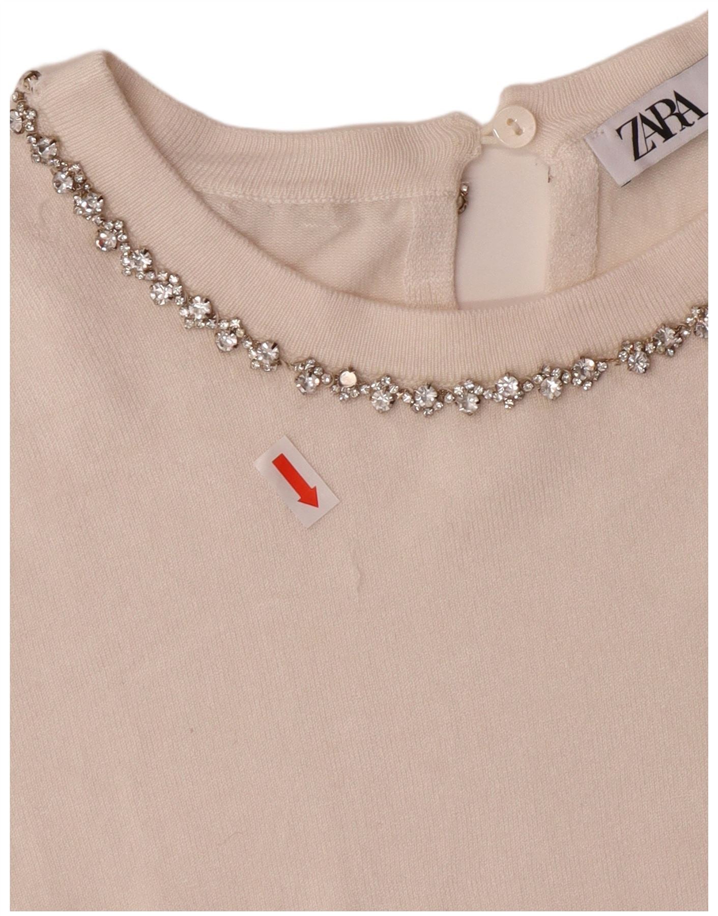 - AI Description: This Zara women's sweater in off-white knit is crafted from viscose blend. The round neck and long sleeves offer a classic silhouette. A regular fit ensures comfortable wear. The pullover style makes it easy to wear. Rhinestone detailing around the neckline adds a touch of subtle glamour. A versatile piece for layering or wearing on its own.