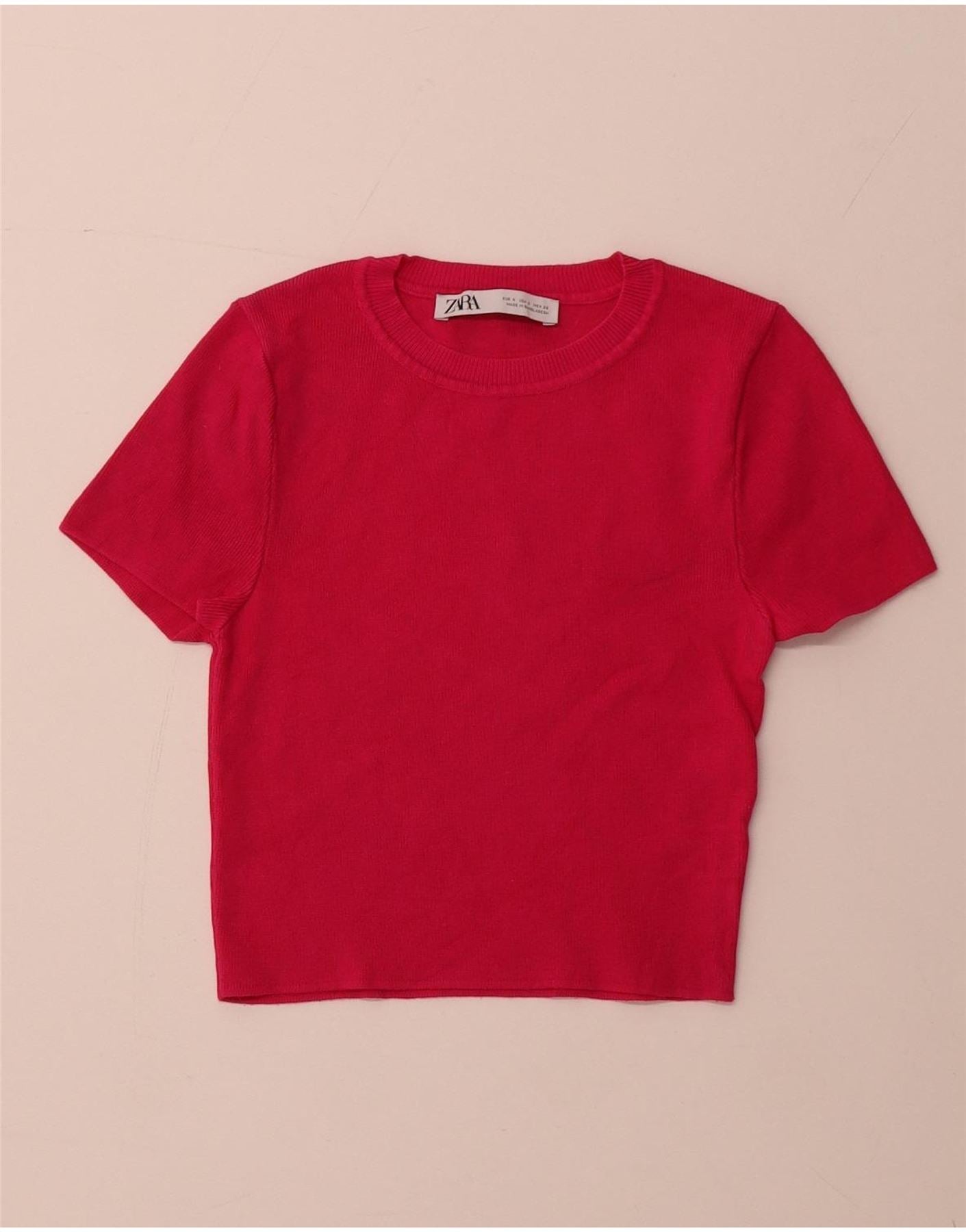 ZARA Womens Crop Short Sleeve Crew Neck Jumper Sweater UK 8 Small Pink