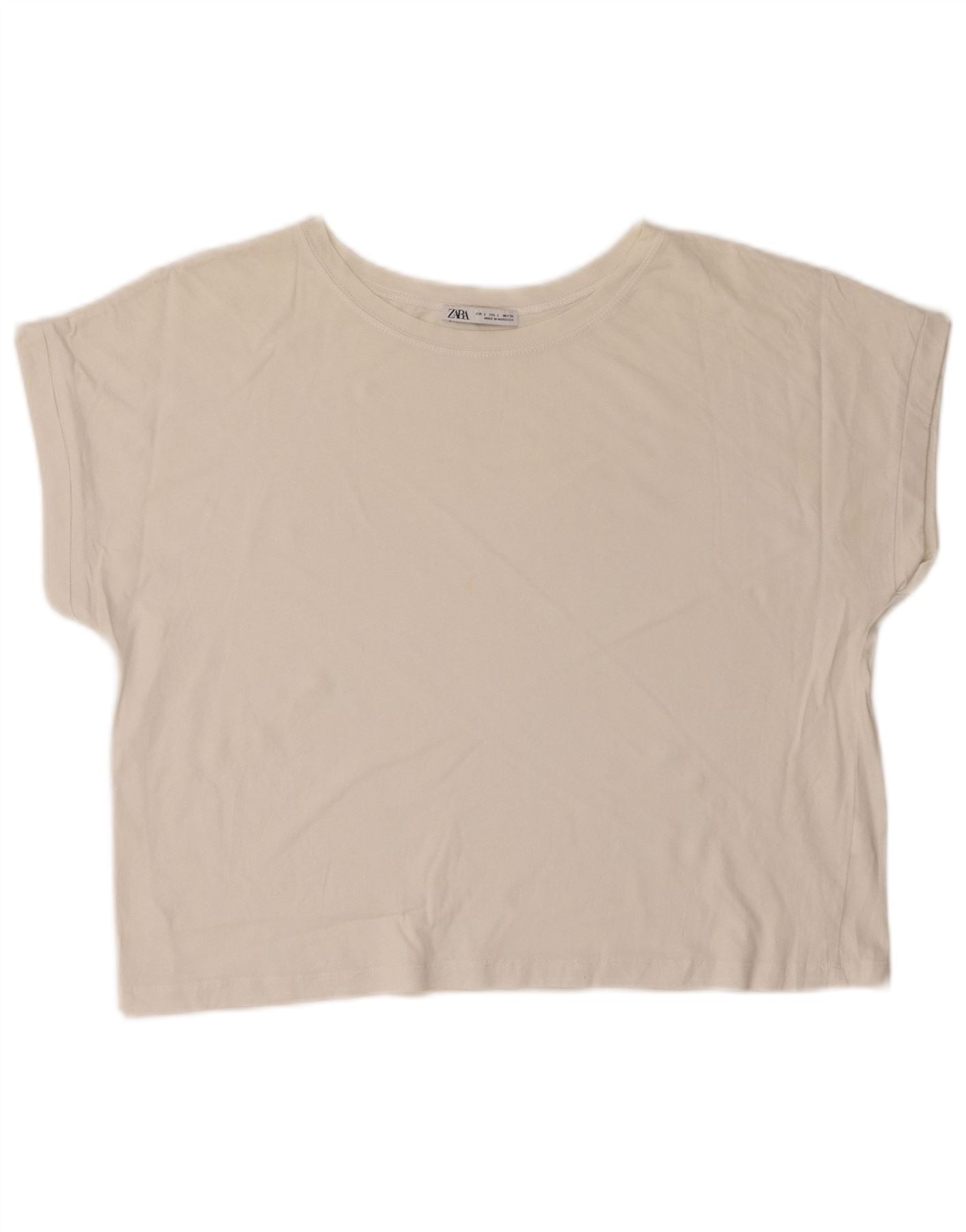 - AI Description: This Zara womens T-shirt top is crafted from soft off-white jersey fabric. It features a classic round neckline and short sleeves. The relaxed fit offers comfort and ease of wear. Its cropped length adds a modern touch. The pullover style ensures a clean, minimalist design, perfect for everyday comfort.