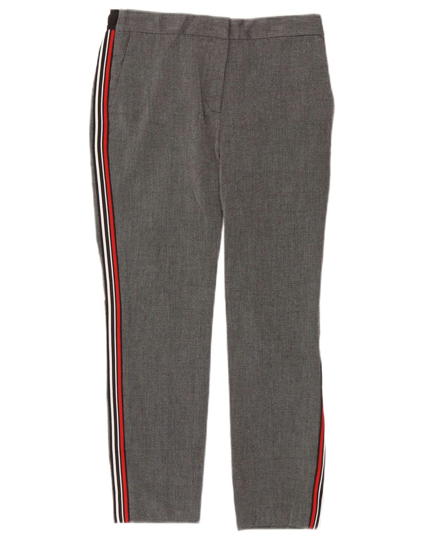 - AI Description: Discover timeless style with these Zara Womens Grey Trousers. Designed for a comfortable regular fit, they feature a classic grey hue enhanced by a sporty side stripe in red, white, and blue. The trousers offer a pull-on style with an elasticated waistband for ease of wear and practical pockets. Crafted from a polyester blend, these trousers are perfect for smart-casual occasions, blending comfort with a touch of athletic-inspired detailing. A versatile addition to any wardrobe.