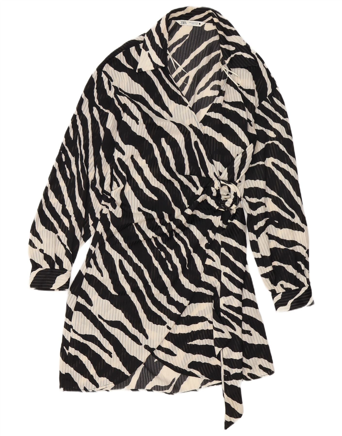 ZARA Womens Long Sleeve Wrap Dress UK 12 Medium Black Animal Print