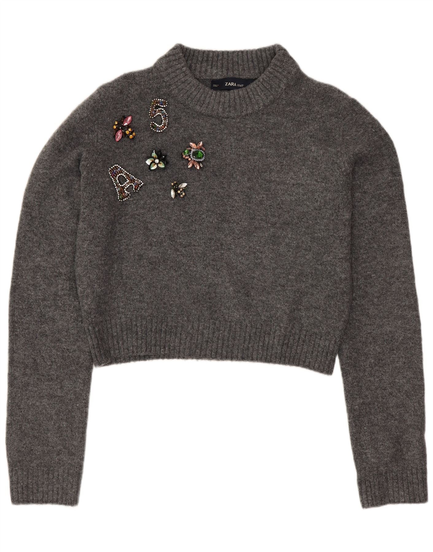 - AI Description: This Zara womens turtle neck jumper sweater is crafted from a soft grey knit blend of acrylic, polyester, and elastane, offering a comfortable stretch. It features a mock neck and long sleeves. The cropped length and regular fit create a modern silhouette. Intricate beaded accents adorn the front, adding a unique, abstract pattern and a touch of sparkle. This pullover design combines warmth with contemporary style.