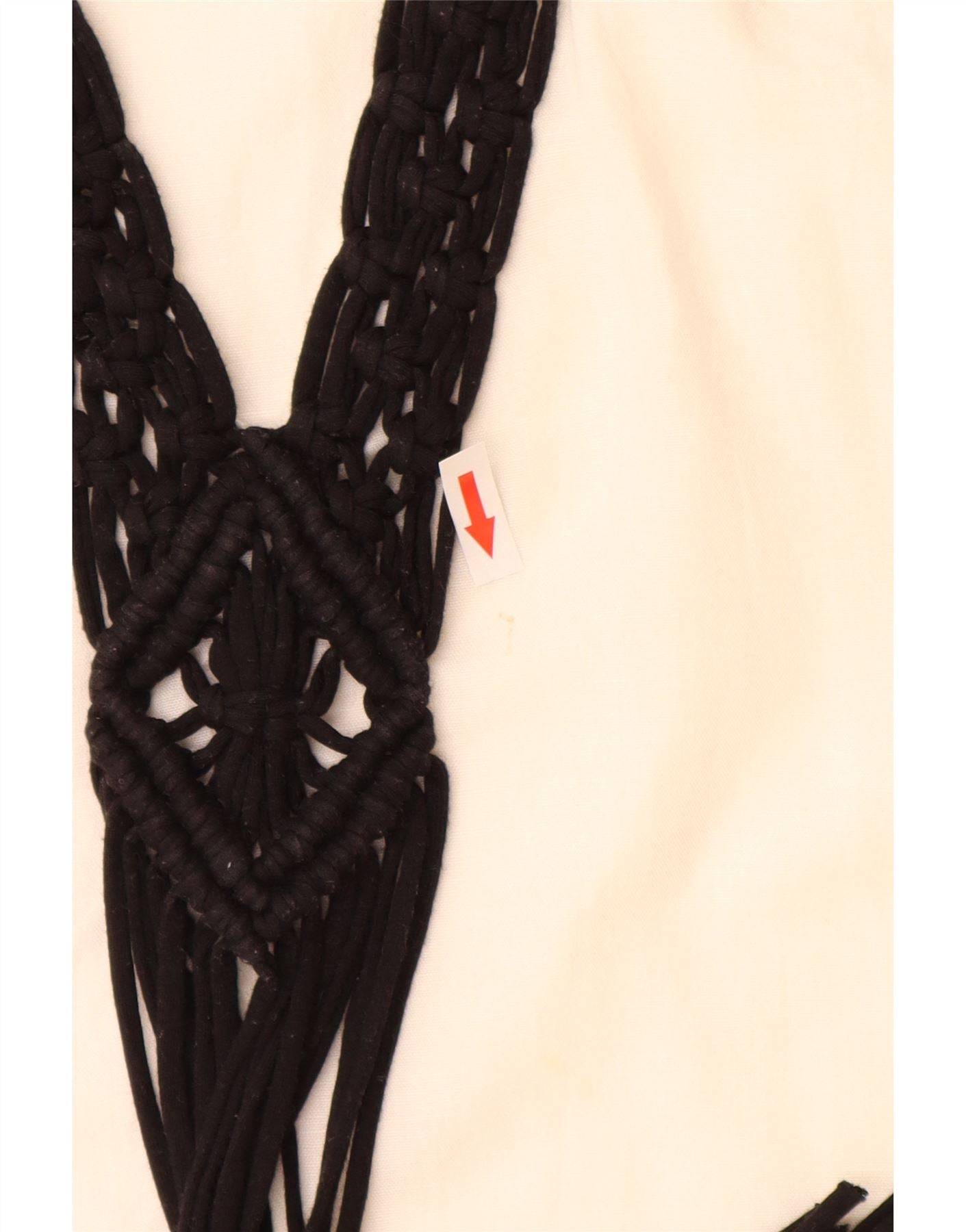 - AI Description: This Zara womens blouse top is crafted from a lightweight off white woven fabric. It features a V-neckline and a sleeveless design. A striking black macrame fringe detail adorns the V-neck, adding a distinctive bohemian touch. The pullover style and regular fit offer a comfortable and effortlessly chic silhouette. This piece combines ease with unique detailing.